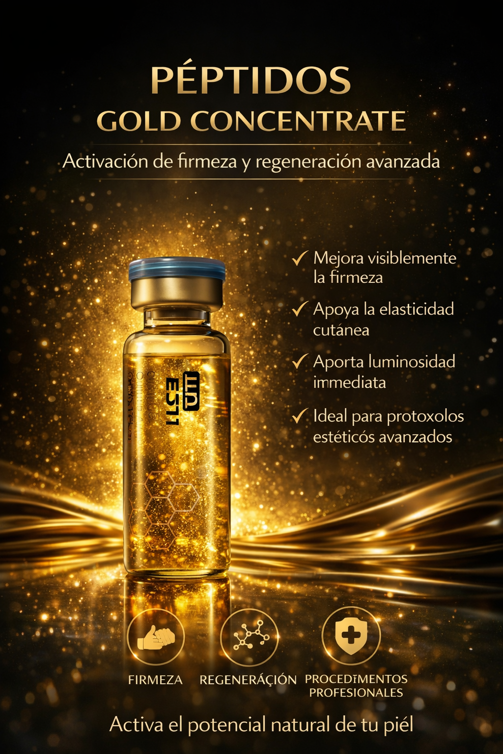 La Ampolla Dorada de Péptidos Gold Concentrate es un suero profesional de regeneración avanzada diseñado para activar la firmeza, estimular la elasticidad cutánea y proporcionar un efecto glow luminoso inmediato en tratamientos estéticos de alto nivel.